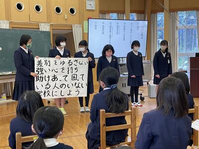「差別をゆるさない強い心を持ち、助け合って困っている人のいない学校にしよう」