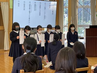 また、熊本県人権子ども集会をまとめた動画も視聴しました。他校での取組を知り、刺激をもらいました。あいさつ、たてわり活動、他校・地域施設との交流も人権を大切にすることにつながるということがわかりました。