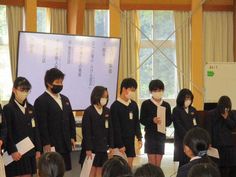 八竜小学校の人権宣言文は、「差別をゆるさない強い心を持ち、助け合って困っている人のいない学校にしよう」です。