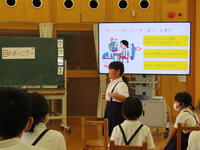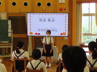 今日の業間は発表集会があり、保健・体育委員会が発表を行いました。