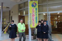 民生委員会長の森さんも参加され、元気なあいさつができました。のぼり旗の言葉は、子供が考えた「さかもとに 笑顔の花を さかせよう」です。