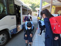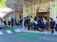 小学校は、バスを降りた人から順番に、全員で挨拶運動を行っています。
