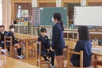 1年生教室では、紙芝居の中に登場した磁石の実物を持ってきていただいており、読み聞かせが終わった後に、さわって遊んでいる様子が見られました。