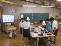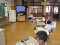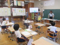 1年生は「やくそく」という物語の学習です。デジタル教科書で音読のお手本が流れます。テレビ画面には教科書が映し出され、音読している文章が黄色くなっていきます。子供たちは、テレビ画面と教科書を交互に見ながら音読のお手本を聞いていました。改めて、便利な世の中になったな~と感じたところです。音読のお手本を聞いた後は、それぞれ感想を書いていました。