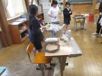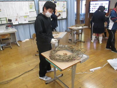 地域の方に、かずらを準備していただきました。大小様々なかずらを準備していただきましたので、子供たちは好きなかずらを選び、円にして束ねていきました。「子供たちにできるかな?」と心配していましたが、上手に円を作ることができました。