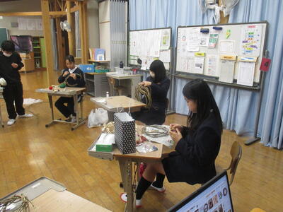 次は、飾り付けです。飾りは、自分たちで準備をしました。自然のドングリやナンテン、マツボックリ、お店で買ったキラキラ光るものなど様々でした。お気に入りのリースを作ろうと、みんな集中していました。どんなリースができあがるのか楽しみです。