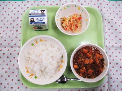 今日の献立は、麦ご飯、牛乳、マーボー豆腐、もやしのナムルでした。