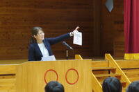 用務員の先生から卒業生にプレゼントしたいものがあるとの申し出がありました。プレゼントしたいものというのは、何と「甲子園の土」でした。ご本人が高校球児で、高校3年生の時に甲子園に出られたそうです。そのときの思い出なども卒業生に話していただきました。貴重な土をいただき、ありがとうございました。