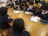 6年生にとって、小学校生活最後の給食となりました。卒業のお祝いということで、赤飯でした。丁度よい塩味で美味しかったです。また、急遽ケーキも準備することができました。これまで、少しずつ材料費を切り詰め、ケーキ代を生み出していただきました。これまでの給食に感謝し、これからもたくさん食べてください。