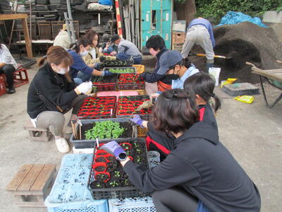 9日は、5年生の保護者の方々や児童・生徒が参加し、国道の花壇への葉ボタンの苗植えと、パンジーのポットあげの作業が行われました。多くの方に参加いただいたので、どんどん作業が進みました。皆様、お疲れさまでした。ありがとうございました。