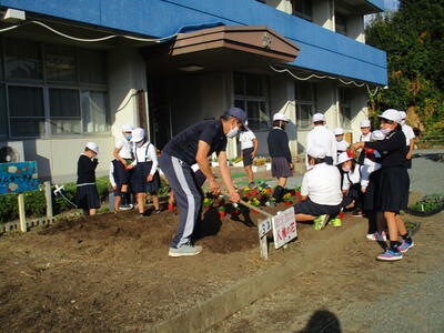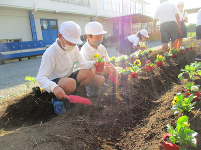 冬の到来を前に、八嘉花づくり委員会様からたくさんの花苗をいただきました。さっそく3年生たちが花壇に植えていました。身近に花があると、華やかになり心地よいですね。いつも八嘉小を支えていただき、ありがとうございます。