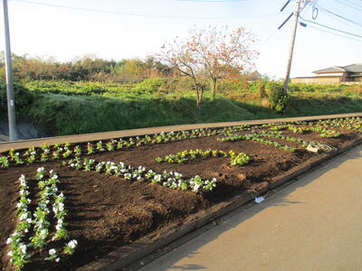 八嘉花づくり委員会の活動日。葉ボタンの苗を田崎交差点と大倉の花壇に植えました。配色を考えて植えられ、とてもきれいです。「小学校にも元気な苗を持って行ってください」と、12ケースもの葉ボタンをいただきました。毎年ありがとうございます。子どもたちと大事に育てます。