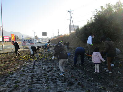 今回は、2年生の保護者の方々や児童が参加し、国道花壇の草取りや花がら摘みを行いました。花壇にはうっすら霜が降りていましたが、たくさんの子どもたちが元気な声を弾ませて活動し、保護者の皆様に参加いただいたので、楽しく一気に作業が進みました。皆様ありがとうございました。