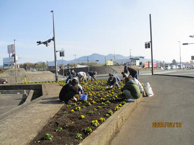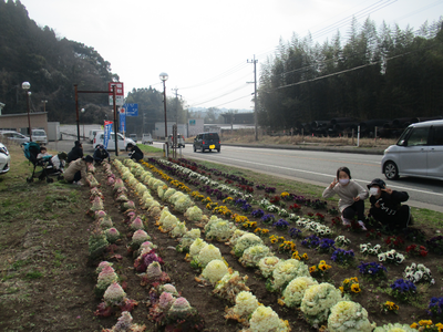 八嘉花づくり委員会のみなさんに教えていただき、種まき、ポットあげの作業をしてきた3年生。大きく育ったパンジーの苗を、国道の花壇に植えました。「八っか子」の文字がきれいに見えます。見事に仕上がりましたね。おめでとう!! これまでのご指導に感謝です。
