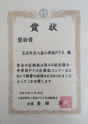 また、全国小・中学校PTA広報紙コンクールで、奨励賞の受賞、誠におめでとうございます。