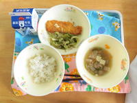 本日のメニューは、麦ごはん、牛乳、キムチとっくスープ、豚肉の塩こうじ炒め、変わりいんげんです。トックスープは韓国の伝統的なスープ料理で、主にもち米から作られた薄切りのお餅「トック」を使った料理です。韓国では、特にお正月に食べる習慣があり、新しい年の初めに無病息災や長寿を願っていただきます。日本でいう“お雑煮”のような存在です。今日は、ピリッとしたキムチの風味を加えたトックスープに仕上げました。体が温まる一杯を美味しくいただきましょう。