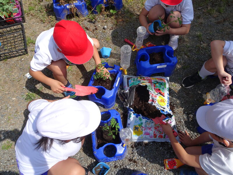 2年生では、生活科の学習で花や野菜を育てます。今日は、一人一人がミニトマトの苗を植えました。