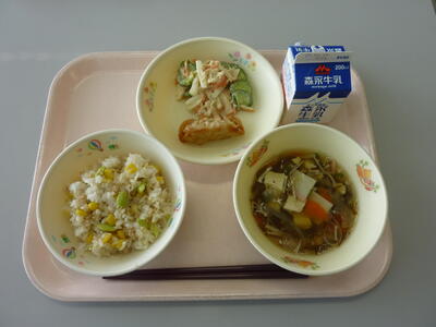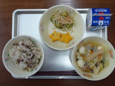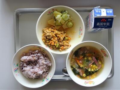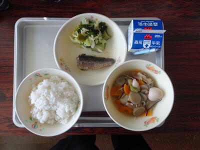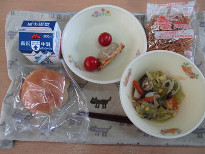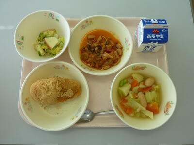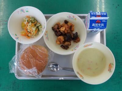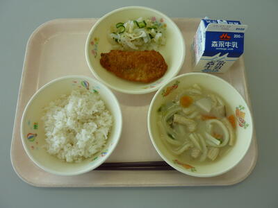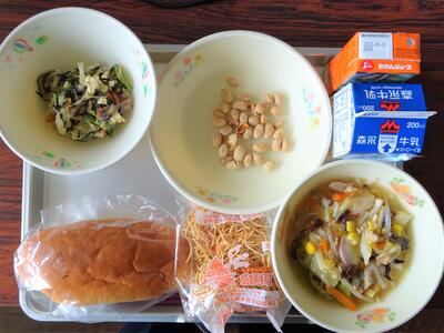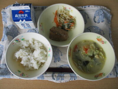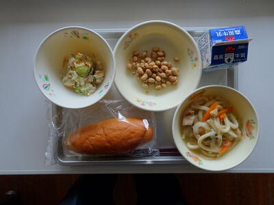 今日のメニューは、食パン、カレーうどん、黒糖ビーンズ、ツナサラダです。黒糖ビーンズは「かむ」ことを意識したメニューです。「かむ」ことの効用を調べると、胃腸の働きを促進する、むし歯・歯周病・口臭を予防する、肥満防止、脳の働きを活発にする、全身の体力向上等々、他にも沢山ありそうです。よく「かんで」食べましょう。