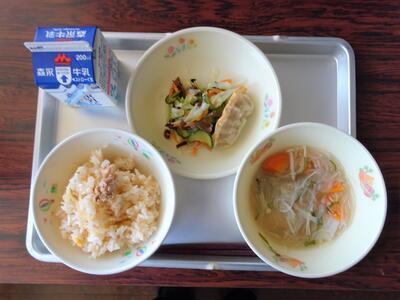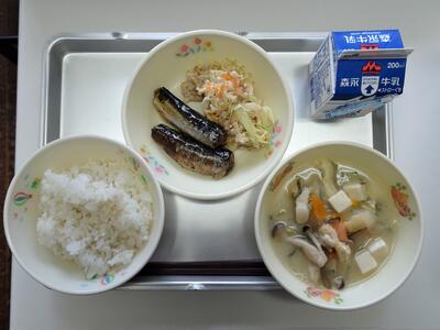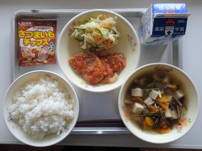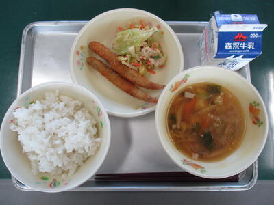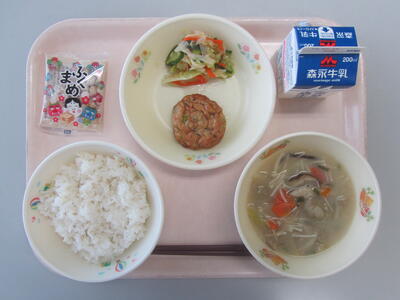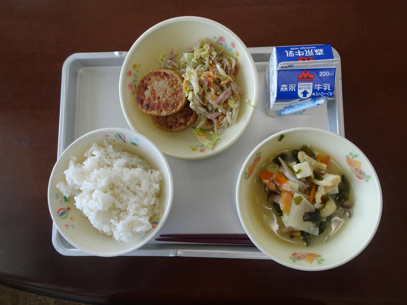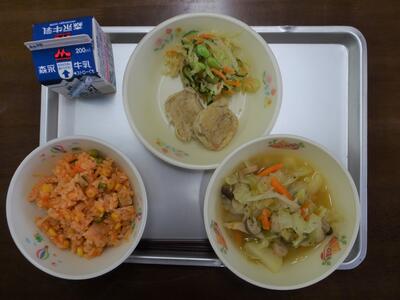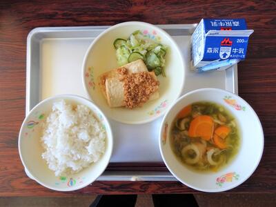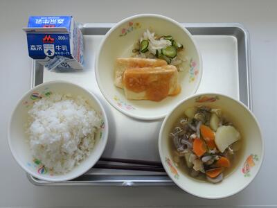 今日のメニューは、麦ごはん、お野菜つみれ汁、鶏肉と厚揚げの甘辛炒め、キャベツのおかか和えです。給食には、毎日たくさんの食材が使われ、栄養に偏りがなく、おいしく食べられるよう献立が工夫されています。今日も美味しくいただきました。