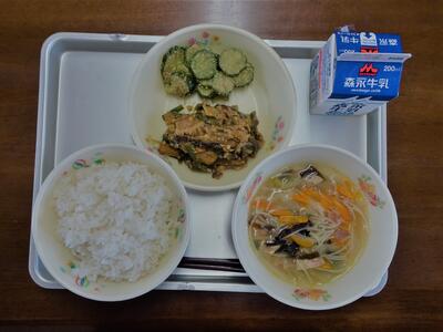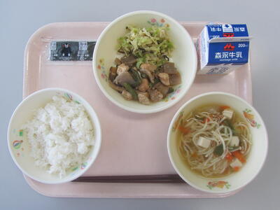 今日のメニューは、麦ごはん、ビーフンスープ、マーボーなす、ごまきゅうりです。私たちは、いろんな原料から作られた「麺」を食べています。今日の「ビーフン」という細い麺は米粉(うるち米)から作られているそうです。