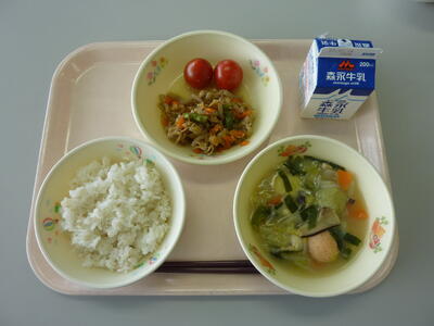 今日はふるさとくまさんデー。八代は、畳の原料となるい草やトマトの生産量日本一!生姜の産地としても有名です。給食には、トマトをつかっただご汁が登場しました。