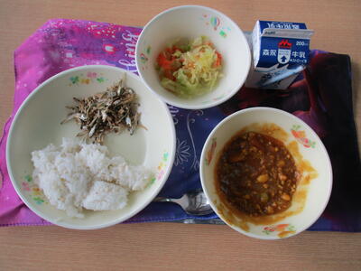 今日のメニューは、麦ごはん、マーボー春雨、にんじんシューマイ、もやしのナムルです。ナムルは韓国の家庭料理の一つで、もやしなどの野菜や山菜を塩ゆでしたものを調味料とゴマ油で和えたものです。今日も美味しくいただきました。