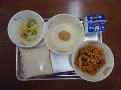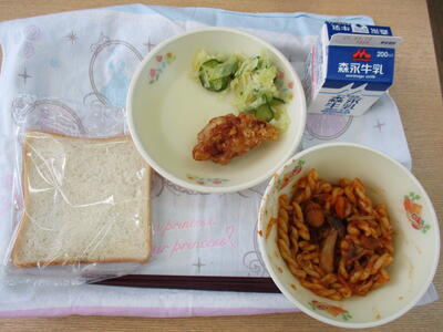 「ボローニャ風パスタ」「とりの唐揚げ」「イタリアンサラダ」「食パン」でした。