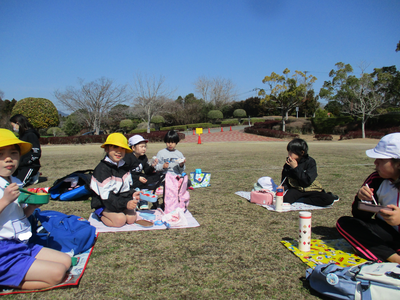 6年生とのお別れ遠足。青空の下、たてわり班のみんなと一緒にお弁当を食べました。とても美味しそうでした。準備、ありがとうございました。
