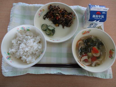「魚そうめん汁」「鶏肉とこんにゃくの炒め煮」「キャベツの昆布あえ」「味付けのり」「麦ごはん」でした。