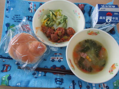 今日のメニューは、コッペパン、ラビオリスープ、ウインナーのケチャップソース、イタリアンサラダです。今日はパンにウインナーをはさんで、セルフドッグです。ラビオリスープもついて、イタリアン風のメニューです。