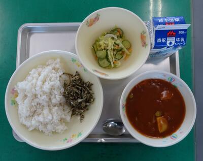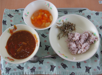 今日のメニューは、雑穀ごはん、かみかみカレー、いりこの酢炊き、フルーツあえ、ジューシーです。