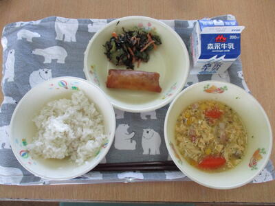 今日のメニューは、焼き肉チャーハン、わかめスープ、春巻き、中華サラダの中華メニューです。焼き肉チャーハンに入っている豚肉には、疲労回復によいとされるビタミンB1が多く含まれています。しっかり食べて、夏を乗りきろう。