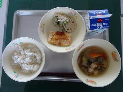 今日のメニューは、ミルクパン、根菜スープ、鶏肉のマスタード焼き、イタリアンサラダです。根菜スープには、じゃがいも、たまねぎ、にんじん、ごぼう、れんこんと5種の根菜類が入っていました。鶏肉のマスタード焼きは辛くもなく、美味しくいただきました。