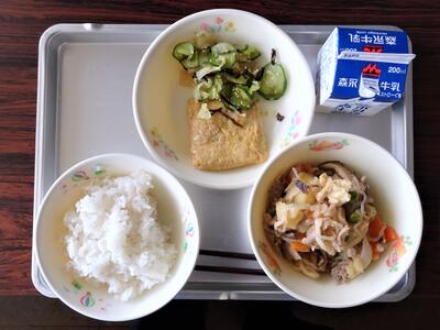 今日のメニューは、麦ごはん、夏野菜ののっぺい汁、豚肉の生姜煮、ブロッコリーのごま和えです。豚肉にはビタミンB1がたくさん含まれています。ビタミンB1が不足すると、疲れやすくなったり、食欲不振になったりすることがあると言われています。夏バテしないよう、ビタミンB1をしっかりとりましょう。