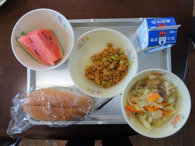 今日のメニューは、コッペパン、ポトフ、ドライカレー、すいかです。今日は6月のお誕生日献立、季節の果物でお祝いです。6月生まれの皆さん、おめでとうございます。
