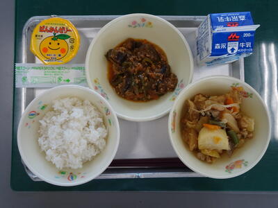 今日のメニューは、麦ごはん、南関あげのうま煮、なすのひこずり、ばんかんゼリーです。