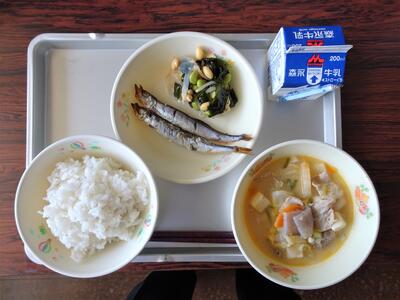 「はくさいのみそ汁」「さんまみぞれ煮」「キャベツといんげんのごま和え」「麦ごはん」でした。