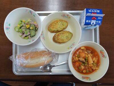 今日のメニューは、ソフトフランスパン、チキンビーンズ、ほうれん草オムレツ、コーンと枝豆のサラダです。チキンビーンズには大豆が入っています。大豆はいろんな食品に加工されていますが、最近は肉の食感や味と近くなるように作られた「大豆ミート」も知られています。