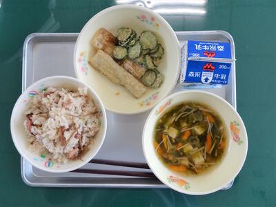 今日のメニューは、たこめし、あおさ汁、太刀魚の香味だれ、ごまきゅうりです。今日は「ふるさとくまさんデー」。天草の郷土料理である「たこめし」と、天草産のあおさを使った「あおさ汁」、美味しくいただきました。