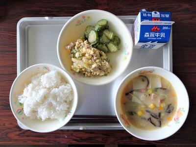 今日のメニューは、そぼろご飯、魚そうめん汁、大豆と豆腐の変わり焼き、ツナの和風あえです。一般的な「そうめん」は小麦粉から作られますが、「魚そうめん」は名前の通り、タラやグチ、ハモなど白身魚のすり身から作られます。