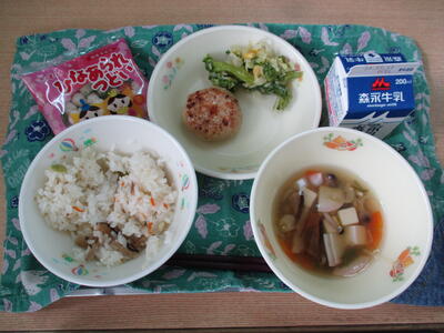 今日のメニューは、麦ごはん、おくずかけ、いわし梅煮、わかめの和えものです。今月の「味の旅」は宮城県の「おくずかけ」です。「おくずかけ」は宮城県の郷土料理で、「葛」でとろみをつけることから「お葛かけ」と呼ばれました。お彼岸やお盆には、「ずんだ餅」と「おくずかけ」をセットでお供えするそうです。
