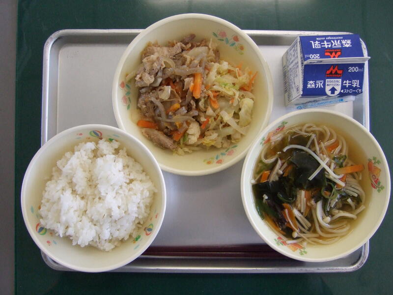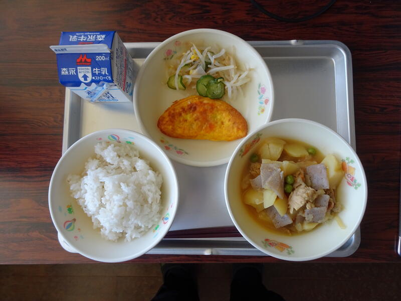 今日のメニューは、食パン、カレーうどん、黒糖ビーンズ、ツナサラダです。黒糖ビーンズは「かむ」ことを意識したメニューです。「かむ」ことの効用を調べると、胃腸の働きを促進する、むし歯・歯周病・口臭を予防する、肥満防止、脳の働きを活発にする、全身の体力向上等々、他にも沢山ありそうです。よく「かんで」食べましょう。