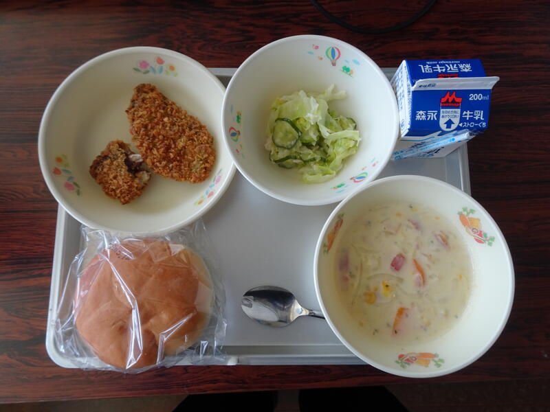 今日のメニューは、食パン、コーンポタージュ、ホキのカレー南蛮、コールスローサラダです。暑さに食欲も落ちてくる季節です。今日は白身魚にカレー味をつけてあり、食欲がわいてきます。