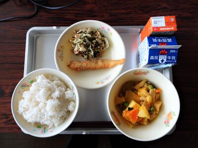 「カレー肉じゃが」「お豆腐しんじょ」「変わりあえ」「麦ごはん」でした。