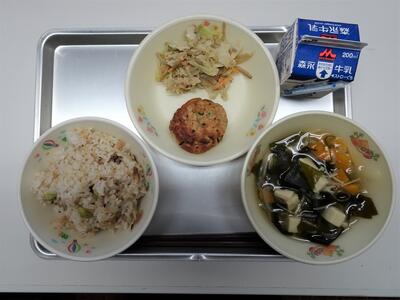 今日のメニューは、栗ごはん、つぼん汁、いわしのしょうが煮、キャベツのゆかりあえです。今月の「ふるさとくまさんデー」は、人吉・球磨地域。山江村の特産品である栗を使った「栗ごはん」と、お祭りやお祝いの時に昔から食べられている郷土料理「つぼん汁」を味わってください。