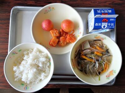 今日のメニューは、麦ごはん、はるさめスープ、たらのチリソース炒め、ハニーローザです。ハニーローザはすももの一種です。栽培が難しく、収穫の時期が非需に短いことから「幻のすもも」と呼ばれています。玉東町が生産量日本一だそうです。