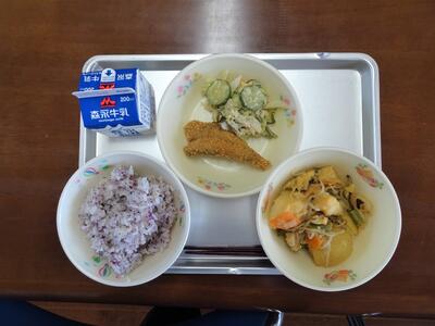 今日のメニューは、麦ごはん、お野菜つみれ汁、鶏肉と厚揚げの甘辛炒め、キャベツのおかか和えです。給食には、毎日たくさんの食材が使われ、栄養に偏りがなく、おいしく食べられるよう献立が工夫されています。今日も美味しくいただきました。