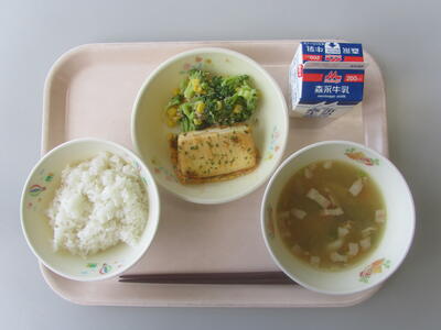 今日のメニューは、麦ごはん、牛乳、じゃがいもときのこのスープ、豆腐のピカタ、ブロッコリーとツナのサラダです。ピカタは、イタリア料理の一つで、肉や魚に小麦粉や溶き卵を絡めて焼いた料理です。今日の給食では豆腐を使っています。美味しくいただきましょう。