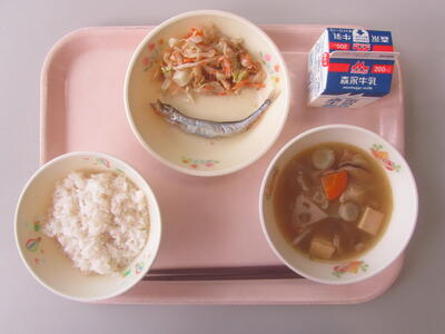 今日のメニューは、麦ごはん、根菜汁、焼きししゃも、ごまネーズあえです。「根菜」とは、地中にある部分を食用にしている野菜のことです。今日の根菜汁には、ごぼう、だいこん、にんじん、れんこん、こんにゃく(蒟蒻芋)が入っています。よく噛んで食べましょう。