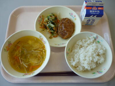 今日のメニューは、麦ごはん、牛乳、わかめスープ、キャベツのメンチカツ、にんじんサラダです。にんじんは、β-カロテンが多い野菜です。β-カロテンは体の中でビタミンAに変換され、皮膚や粘膜を健康に保つ働きがあります。今日はにんじんサラダで、β-カロテンをたくさんとりましょう。